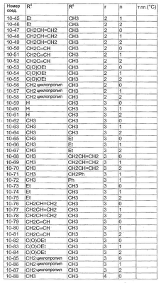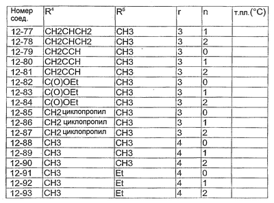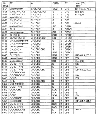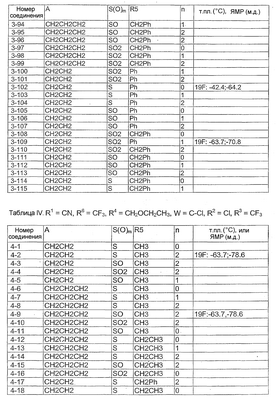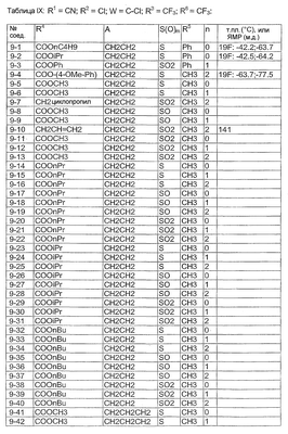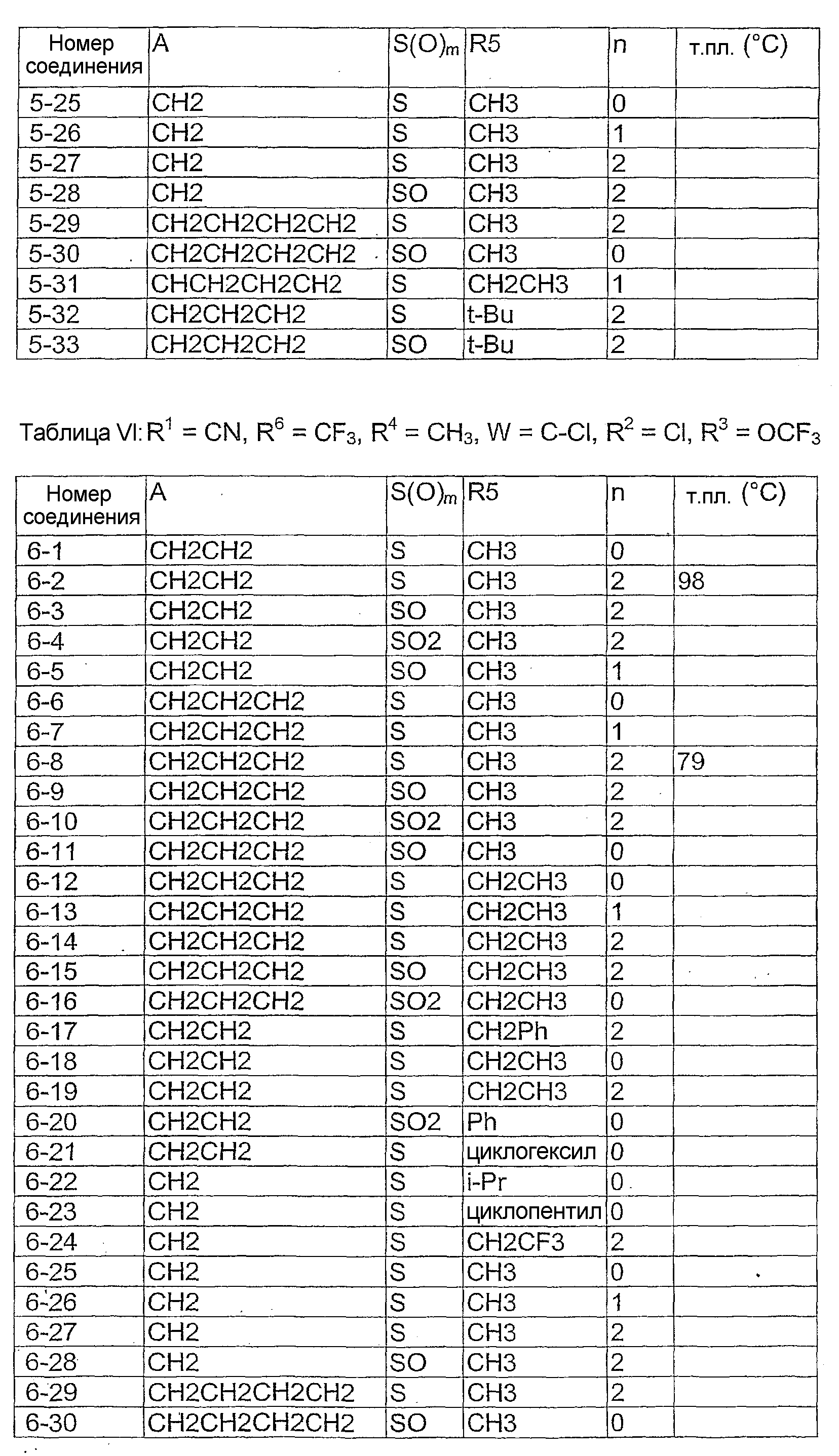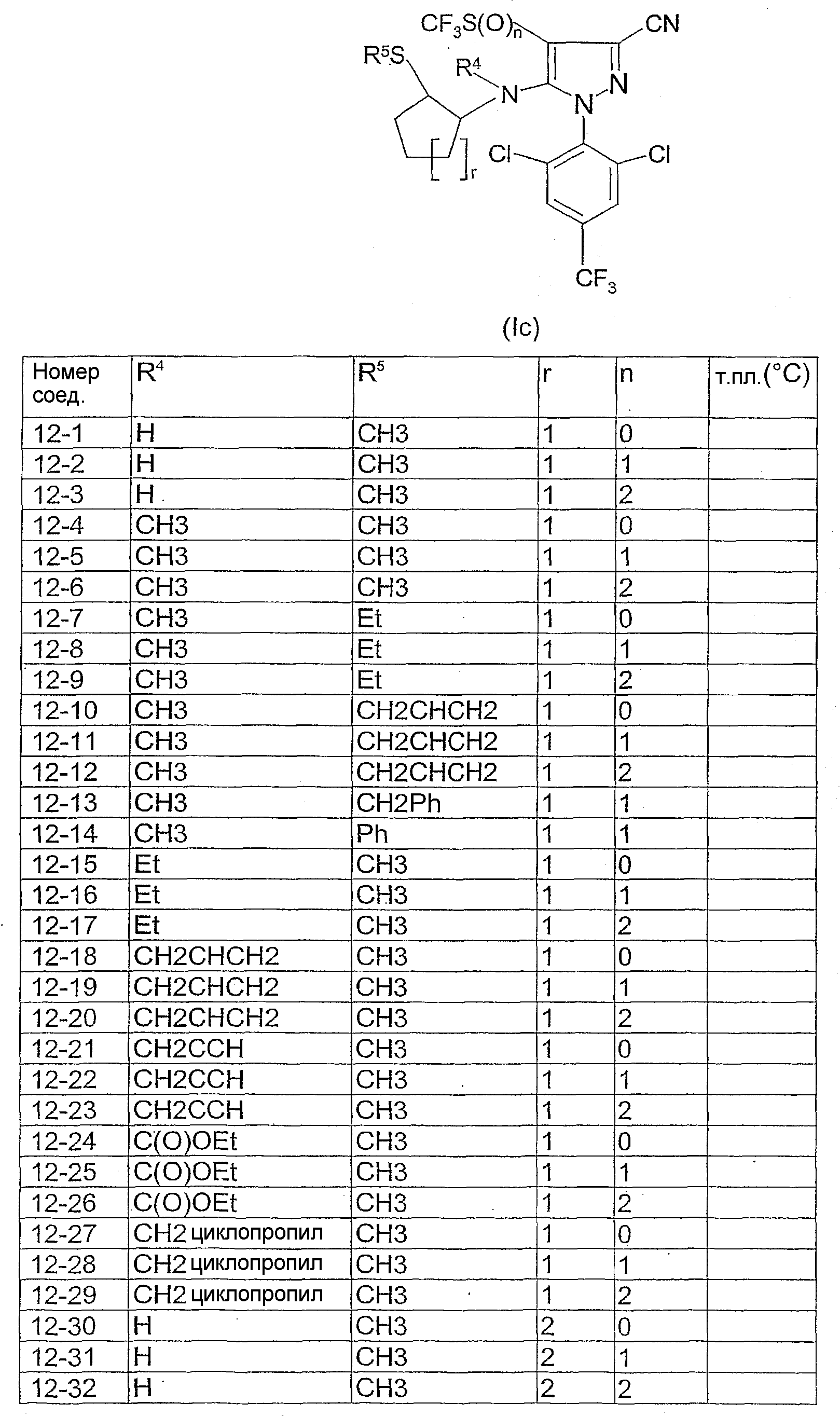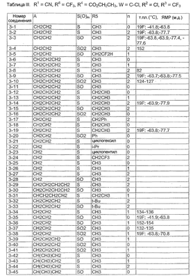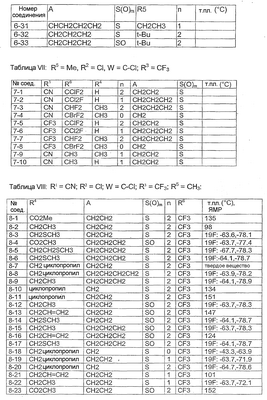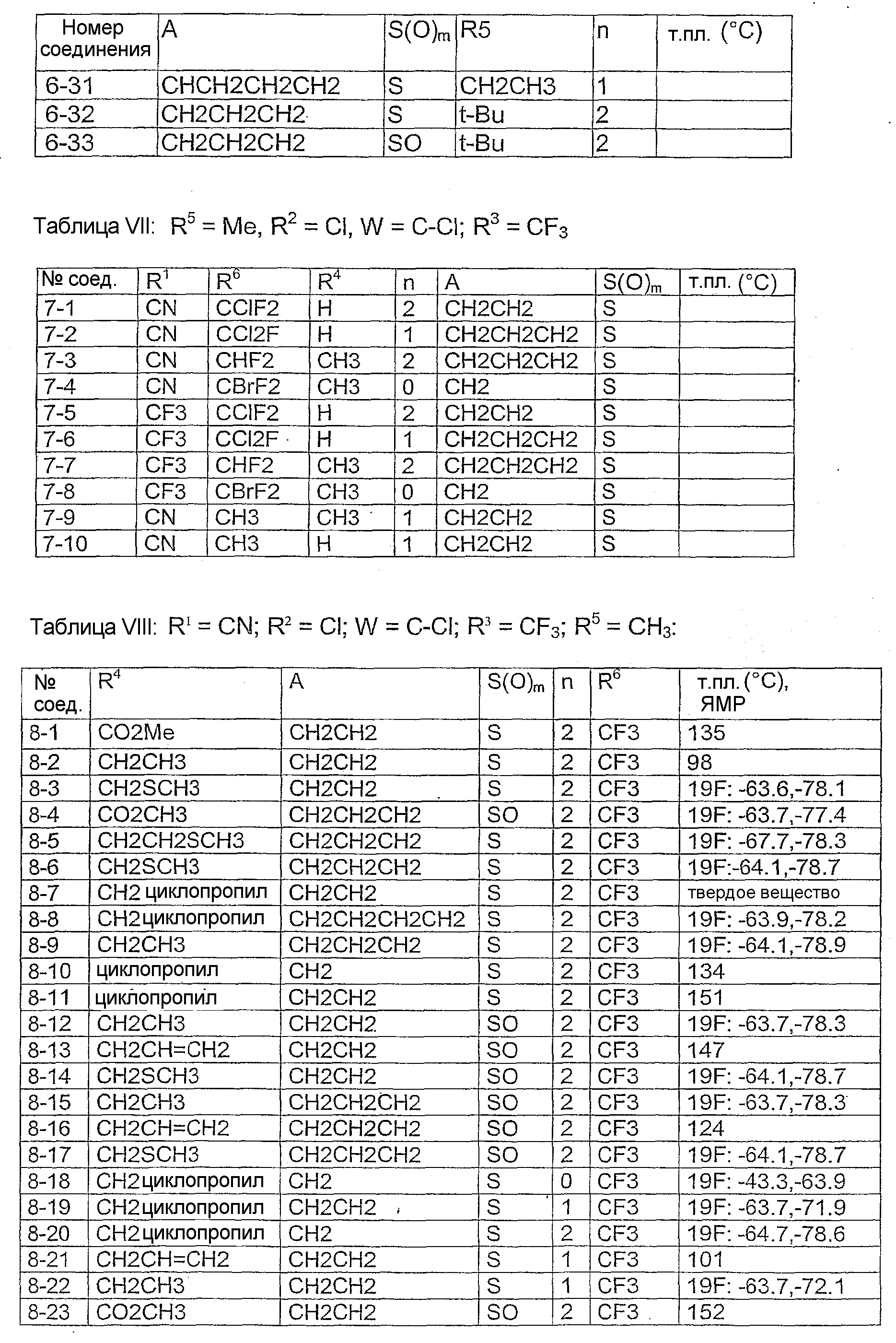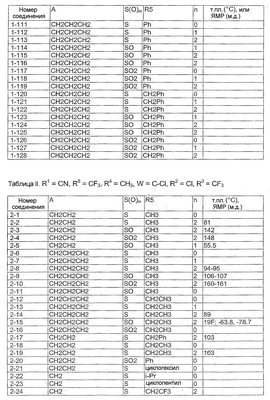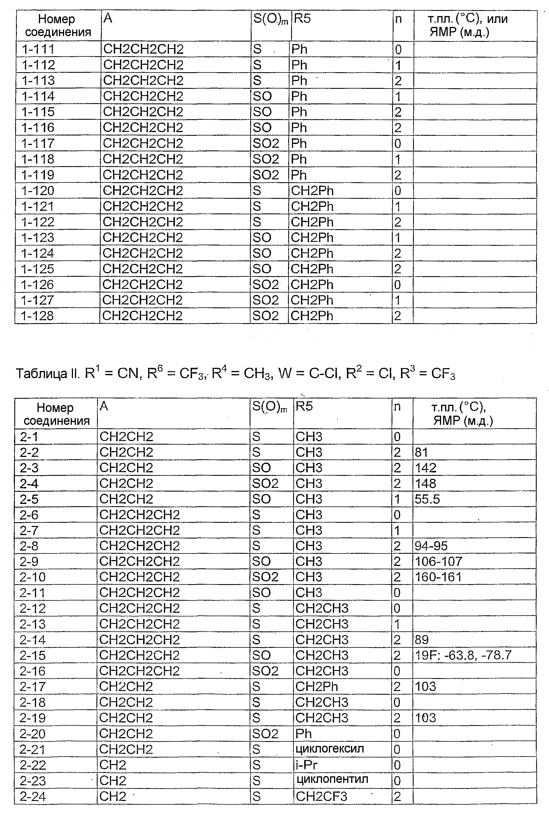 Эти ингредиенты смешивают в виде 45% взвеси (суспензии) с водой, измельчают с использованием мельницы мокрого помола до размера частиц 4 микрон и затем сушат распылительной сушкой для удаления воды. СПОСОБЫ ПРИМЕНЕНИЯ ПЕСТИЦИДОВ Следующие характерные тест-процедуры с использованием соединений данного изобретения проводили для определения паразитицидной и пестицидной активности соединений данного изобретения. СПОСОБ А: Способ скрининга для испытания системности соединений против Ctenocephalides felis (блохи кошачьей) Тест-контейнер наполняли 10 имаго Ctenocephalides felis. Стеклянный цилиндр закрывали на одном конце парафильмом и помещали на верхнюю часть тест-контейнера. Затем раствор тест-соединения пипетировали в бычью кровь и добавляли в этот стеклянный цилиндр. Обработанные Ctenocephalides felis удерживали в этом искусственном собачьем тесте (кровь 37°С, относительная влажность 40-60%; Ctenocephalides felis 20-22°С, относительная влажность 40-60%) и оценку выполняли при 24 и 48 часах после нанесения. Номера соединений 1-2, 1-8, 1-9, 1-10, 1-14, 1-15, 1-16, 1-17, 1-19, 1-34, 1-35, 1-36, 1-37, 1-38, 1-39, 1-40, 2-2, 2-8, 2-9, 2-10, 2-14, 2-16, 2-17, 2-19, 2-35, 2-36 и 3-19 давали, по меньшей мере, 90% уничтожение Ctenocephalides felis при тест-концентрации 5 м.д. или менее. СПОСОБ В: Скрининг с Diabrotica undecimpunctata (южной блошкой длинноусой) За два дня перед нанесением семена кукурузы замачивали в воде в теплых условиях для индукции быстрого прорастания. За один день перед нанесением, яйца Diabrotica undecimpunctata переносили на одну половину Японской фильтровальной бумаги, помещенной в пластиковую чашку Петри. После этого проросшее семя кукурузы помещали на увлажненную подушечку рядом с этой фильтровальной бумагой. На это яйцо осторожно пипетировали три капли из 200 микролитров раствора тест-соединения. Остальной раствор помещали на кукурузу и затем эту чашку Петри закрывали. Обработанные яйца в чашках Петри выдерживали в климатических камерах в течение 6 дней. Эффективность соединения (процент мертвых яиц и/или личинок в сравнении с необработанным контролем) оценивали спустя 6 дней после нанесения с использованием бинокулярного микроскопа. Номера соединений 1-17, 1-19, 1-35, 1-36, 1-38, 1-39, 2-9, 2-19, 2-35 и 2-36 давали по меньшей мере 90% уничтожение Diabrotica undecimpunctata при тест-концентрации 10 м.д. СПОСОБ С: Скрининг с Nephotettix cinciceps (цикадкой рисовой) Листья 12 растений риса, имеющих длину стеблей 8 см, погружали на 5 секунд в водный раствор приготовленного в виде готовой формы тест-соединения. После стекания этого раствора растения риса, обработанные таким образом, помещали в чашку Петри и заселяли приблизительно 20 личинками (стадии L3) Nephotettix cinciceps. Чашку Петри закрывали и затем выдерживали в климатической камере (16 часов света в сутки, 25°С, относительная влажность 40-60%). После 6 дней выдерживания определяли смертность в процентах личинок цикадок. Номера соединений 1-8, 1-9, 1-19, 1-35, 1-37, 2-2, 2-8, 2-19 и 2-36 давали по меньшей мере 98% смертность личинок Nephotettix cinciceps при тест-концентрации 100 м.д. СПОСОБ D: Способ скрининга для испытания контактной активности против Ctenocephalides felis (блохи кошачьей) Растворы тест-соединений помещали по каплям на фильтровальную бумагу, сушили и эту фильтровальную бумагу помещали в тест-пробирки и заражали 10 имаго Ctenocephalides felis. Обработанные Ctenocephalides felis выдерживали в климатической камере (26°С, относительная влажность 80%) и процентную эффективность оценивали спустя 24 часа и 48 часов после
