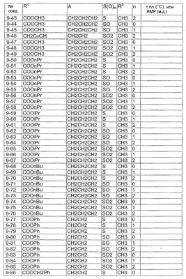 Этилан ВСР абсорбируют на Аэросил, который затем смешивают с другими ингредиентами и измельчают в молотковой мельнице с получением смачивающегося порошка, который может быть разбавлен водой до концентрации 0,001-2 мас.% активного соединения и нанесен на очаг заражения членистоногими, например, личинками двукрылых или нематодами растений, опрыскиванием или на домашних животных, зараженных или имеющими риск заражения членистоногими, опрыскиванием или погружением или пероральным введением в питьевой воде для уничтожения членистоногих. ПРИМЕР 2К Болюсную композицию медленного высвобождения формуют из гранул, содержащих следующие компоненты в варьирующихся процентных количествах (подобно тому, как это описано для предыдущих композиций), в зависимости от потребности: Активный ингредиент Агент плотности Агент медленного высвобождения Связывающее вещество Однородно смешанные ингредиенты формуют в гранулы, которые прессуют в шарик (болюс) с удельной плотностью 2 или более. Он может вводиться перорально жвачным домашним животным для удерживания в сетке-рубце (втором и первом отделах желудка жвачных животных) для получения непрерывного медленного высвобождения активного соединения на протяжении пролонгированного периода времени для уничтожения заражения жвачных домашних животных артроподами. ПРИМЕР 2L Композиция медленного высвобождения в форме гранул, шариков, брикетов или т.п. может быть приготовлена со следующим составом: