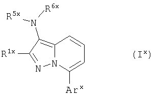 где R1x представляет метокси, этил или метилтио; R5x и R6x каждый независимо представляет группу формулы -Х6x-Х7x (где Х6x представляет 1,2-этилен или метилен; и X7x представляет водород, C1-10 алкил, необязательно замещенный 1-2 группами, выбранными из C1-6алкокси, гидрокси, галогена и ди (С1-6алкил)амино, С3-8 циклоалкил, тетрагидрофуранил, тетрагидротиофенил, тетрагидропиранил, диоксоланил, фуранил, тиенил, фуранил, необязательно замещенный С1-6алкилом или циано, имидазолил, необязательно замещенный С1-6алкилом, тиазолил, оксазолил, диоксанил, пиридил, необязательно замещенный C1-6алкилом, гидрокси, С1-6алкокси или ди(С1-6алкил)амино, пиперидил, необязательно замещенный C1-6алкилом или СОС1-6алкилом, или тиазолил); и Arx представляет фенил, 1,3-бензодиоксолил, нафтил, пиридил; при условии, что Arx может независимо иметь 1-3 заместителя, выбранных из группы заместителей А, определенной в п.1, его соль или их гидрат. 3. Соединение, представленное общей формулой: