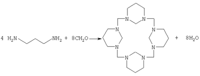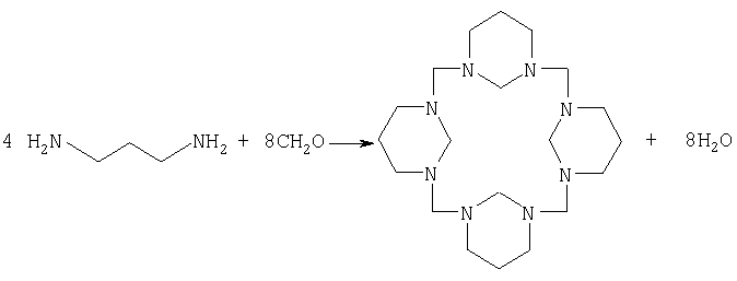 Известно, что конденсация 1,3-диаминопропана с формальдегидом [Die makromolekulare chemie, 1956, v.17, №2, p.77] в диметилформамиде приводит к образованию 1,3,7,9,13,15,19,21-октаазапентацикло[17.5.1.13,21.17,1319,15]октакозана с выходом (80%).