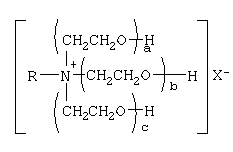Известны так же четвертичные аммониевые соединения, содержащие один или несколько полиоксиэтильных фрагментов. Такими, например, являются четвертичные аммониевые соединения, включающие в структуру аммонийного катиона три полиоксиэтильных фрагмента и имеющие общую формулу:
