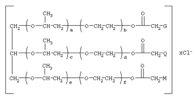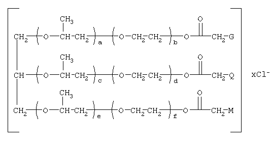 при а+с+е=общая степень оксипропилирования, равная 55; b+d+f=общая степень оксиэтилирования, равная 10; х=3; при G=Q=M=-N+H2CH2CH2NH2; а+с+е=общая степень оксипропилирования, равная 49; b+d+f=общая степень оксиэтилирования, равная 9; х=3; при G=Q=M=-N+H2CH2CH2NH2; а+с+е=общая степень оксипропилирования, равная 55; b+d+f=общая степень оксиэтилирования, равная 10; х=3; при G=Q=-N+H2CH2CH2NH2; М=-Cl; а+с+е=общая степень оксипропилирования, равная 49; b+d+f=общая степень оксиэтилирования, равная 9; х=2; при G=Q=-N+H2CH2CH2NH2; М=-Cl; а+с+е=общая степень оксипропилирования, равная 55; b+d+f=общая степень оксиэтилирования, равная 10; х=2; при G=Q=M=-N+H2CH2CH2OH; а+с+е=общая степень оксипропилирования, равная 49; b+d+f=общая степень оксиэтилирования, равная 9; х=3; при G=Q=M=-N+H2CH2CH2OH; а+с+е=общая степень оксипропилирования, равная 55; b+d+f=общая степень оксиэтилирования, равная 10; х=3;