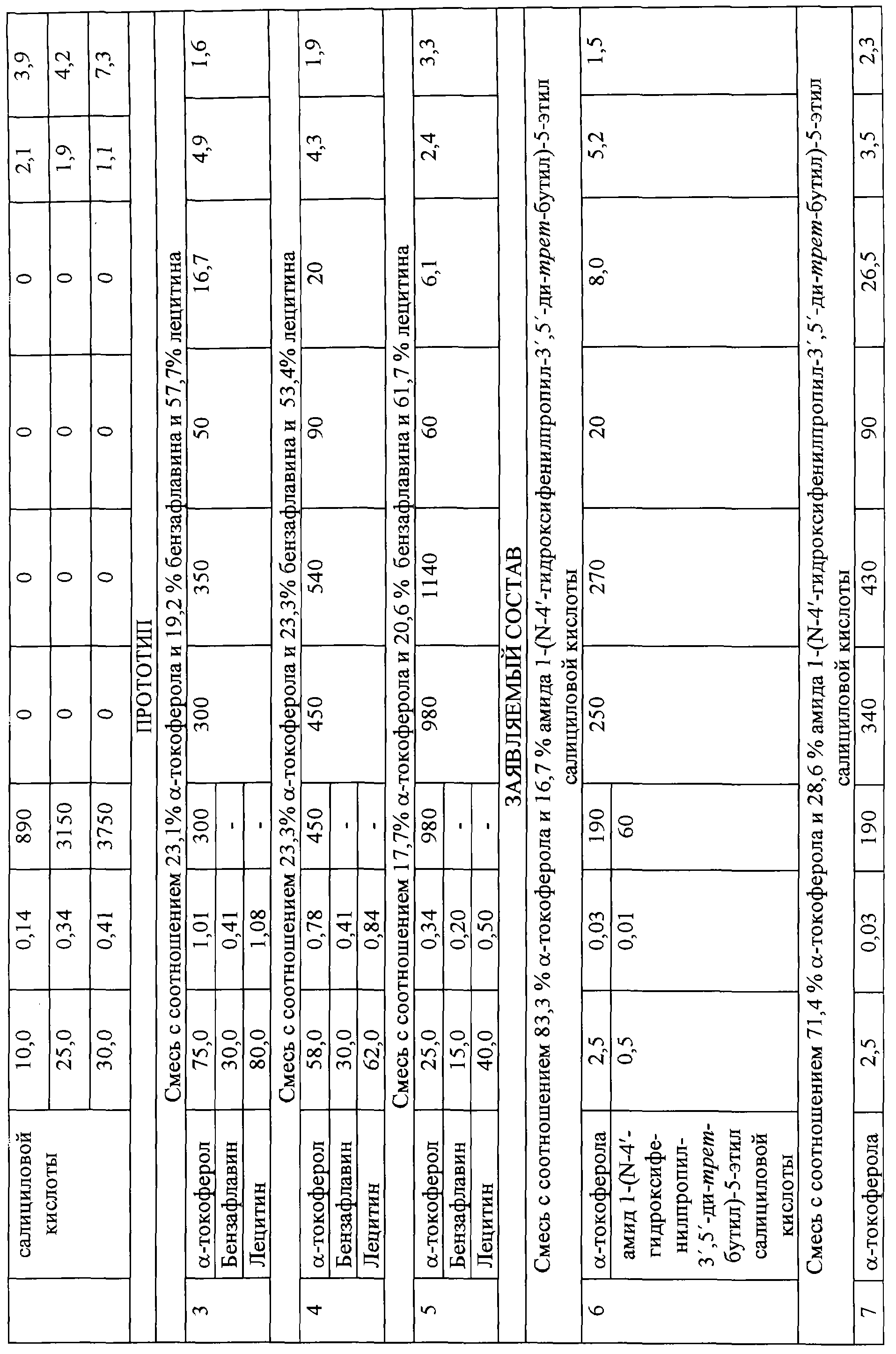 Отличие заявляемого состава от известного состоит в том, что вместо бензафлавина и лецитина используют амид 1-(N-4′-гидроксифенилпропил-3′,5′-ди-трет-бутил)-5-этил салициловой кислоты. Предлагаемое соединение амид 1-(N-4′-гидроксифенилпропил-3′,5′-ди-трет-бутил)-5-этил салициловой кислоты было синтезировано в Новосибирском Институте органической химии им. Н.Н.Ворожцова СО РАН с целью расширения ассортимента нетоксичных биологически активных ингибиторов окисления. Соединения не обладают местным и общетоксическим действием, не оказывают влияния на эмбриогенез и развитие потомства.