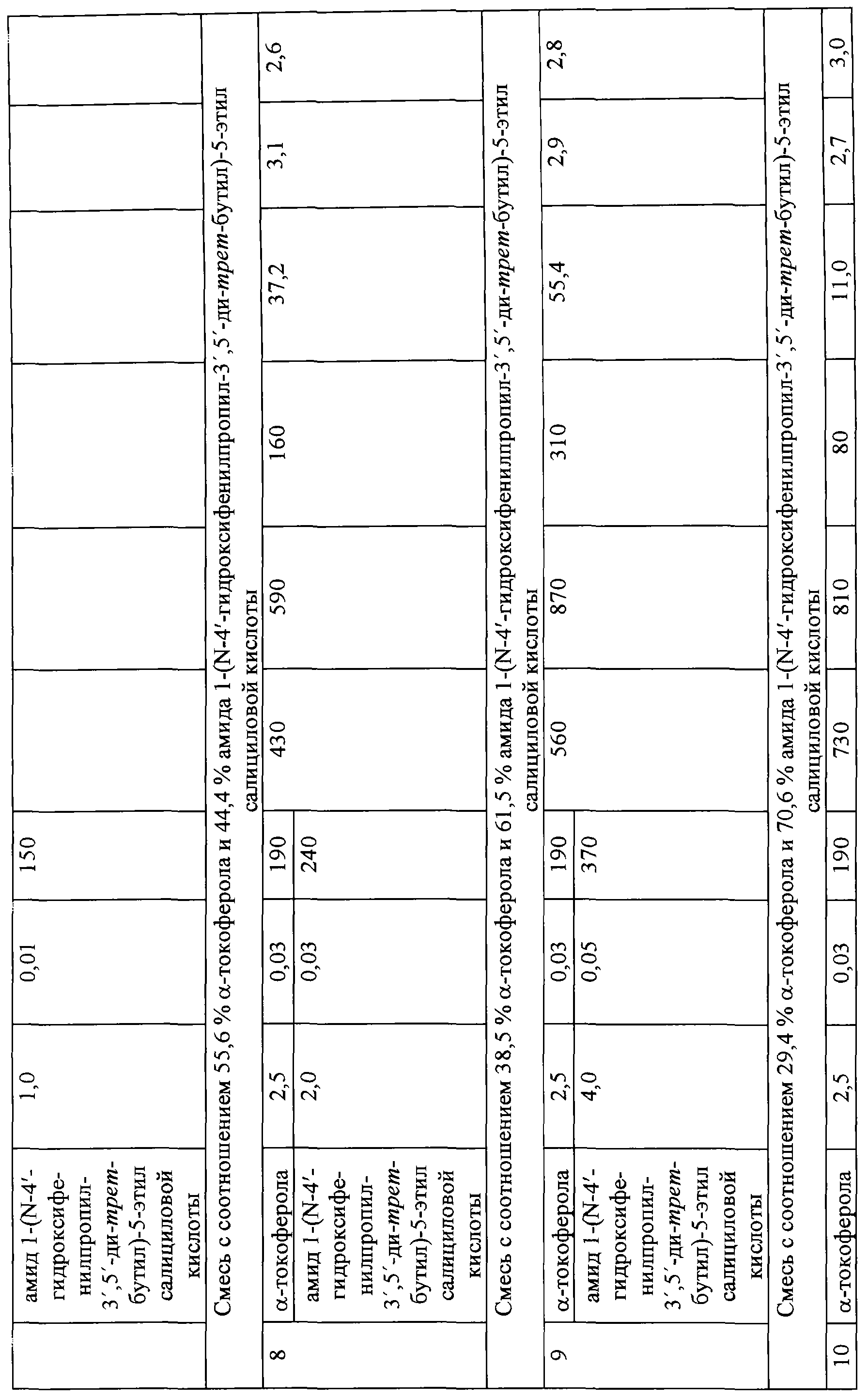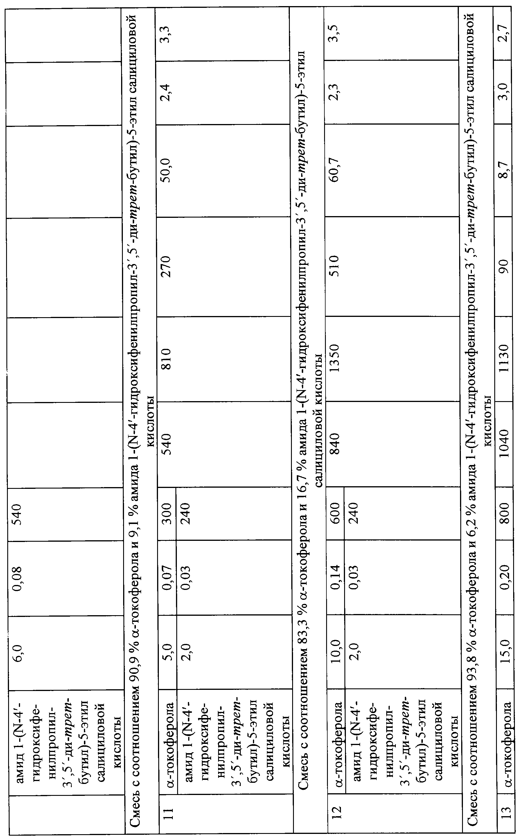 В связи с этим с целью отбора наиболее эффективных синергических смесей более подробно изучались двухкомпонентные составы, включающие -токоферол и амид 1-(N-4′-гидроксифенилпропил-3′,5′-ди-трет-бутил)-5-этил салициловой кислоты, при этом концентрации каждого из компонентов смеси выбирались из указанной области наибольшей эффективности смесей.