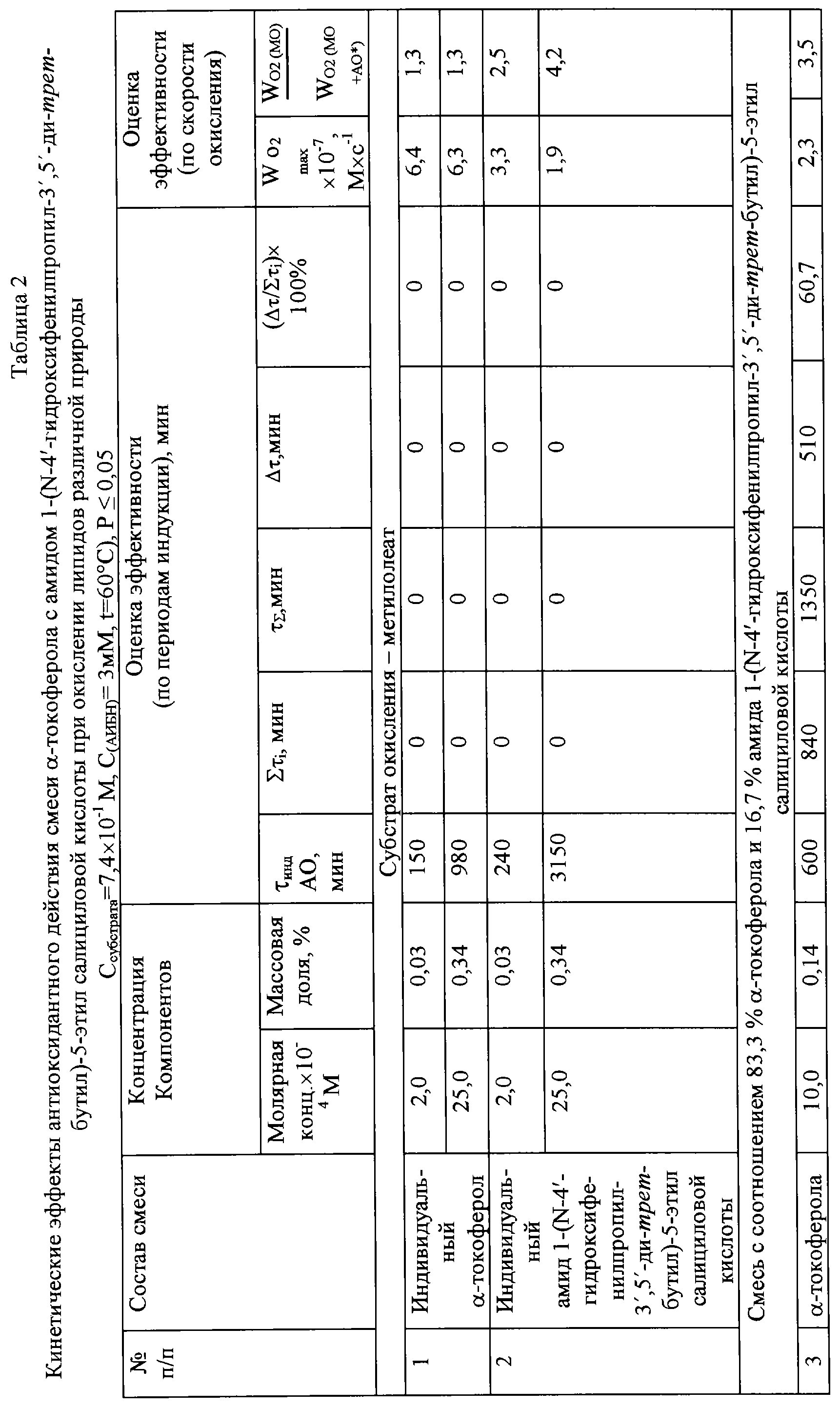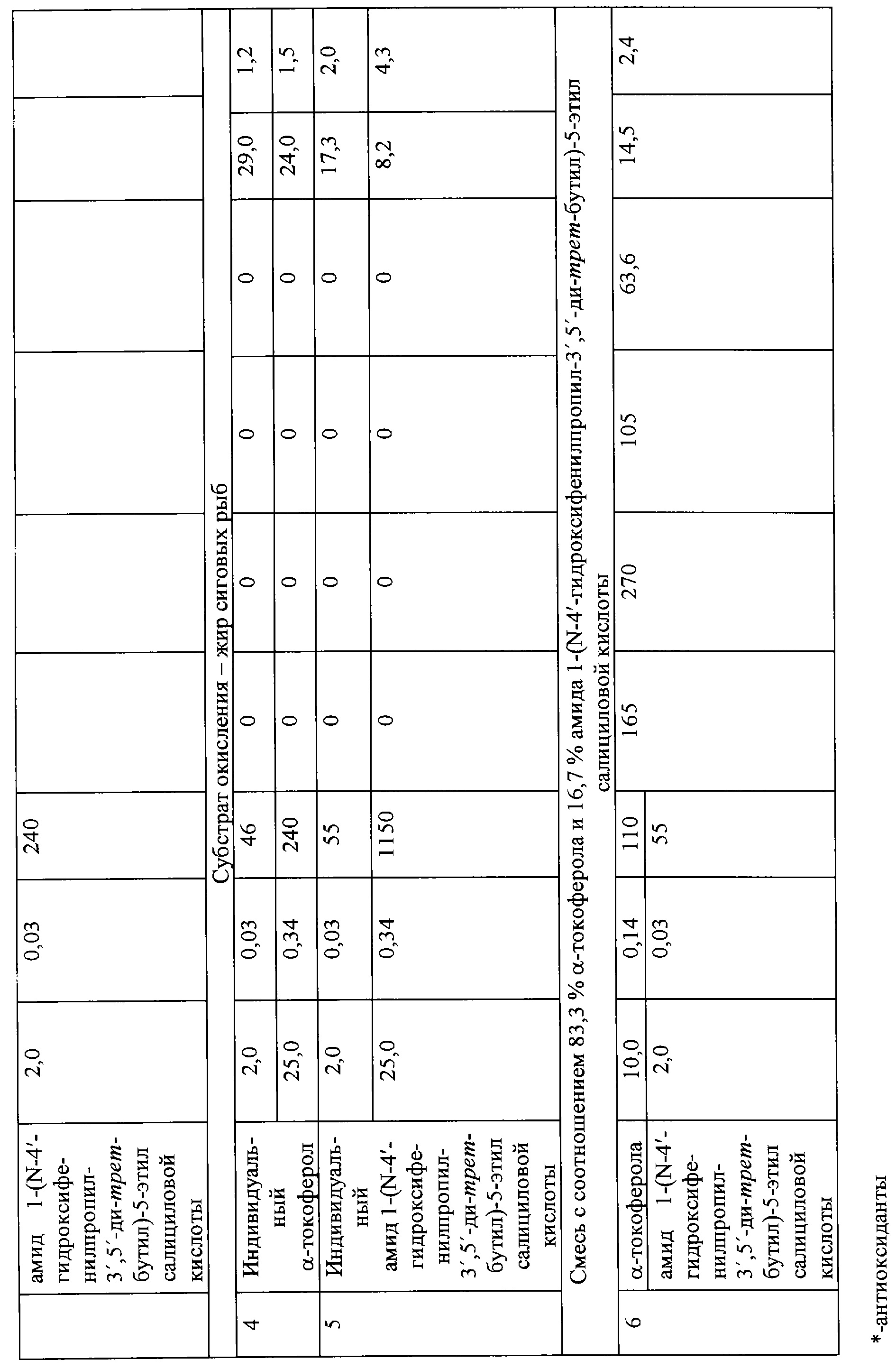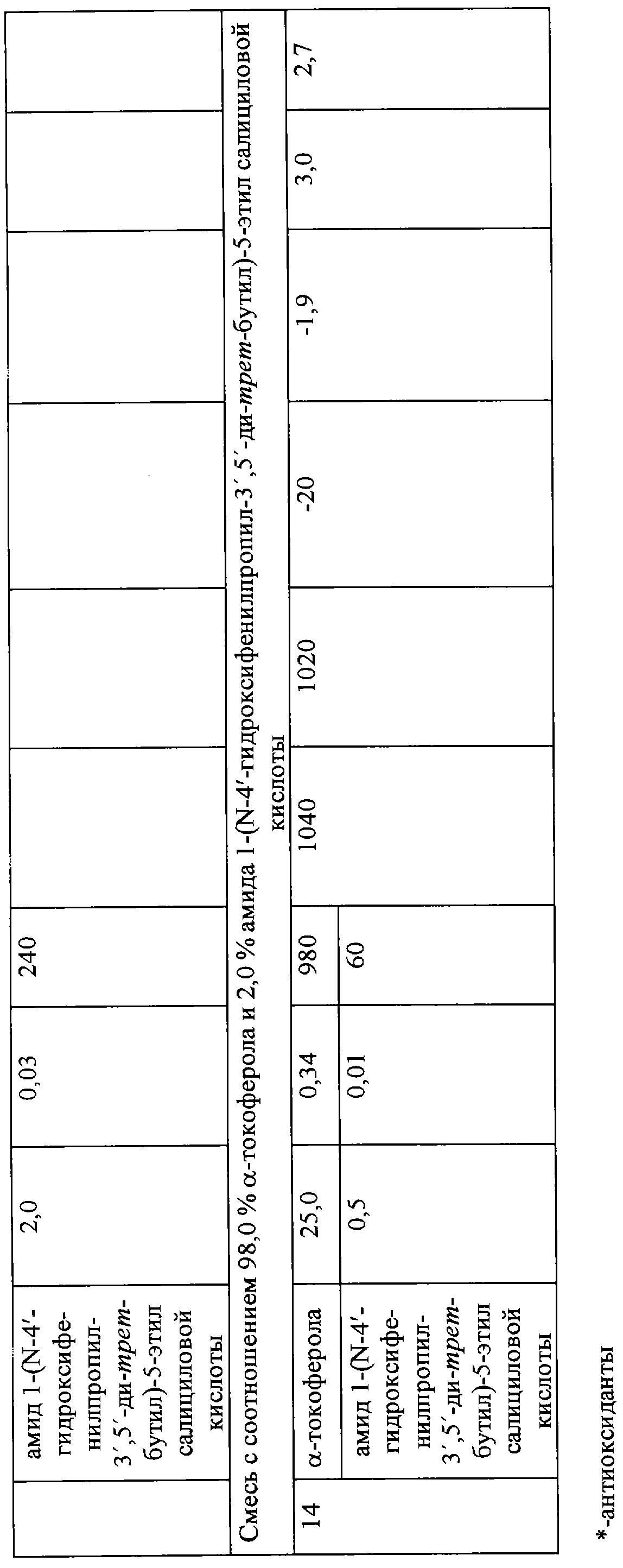 Таким образом, соединение амид 1-(N-4′-гидроксифенилпропил-3′,5′-ди-трет-бутил)-5-этил салициловой кислоты проявляет активность в реакции с пероксильными радикалами с константой скорости реакции К7=0,52×104 М-1×с-1, снижает скорость процесса окисления липидов в смеси с -токоферолом в 2-5 раз, а также дополнительно снижает уровень гидропероксидов, образующихся в процессе окисления липидов, на 71,7% (табл.3). Разрушение гидропероксидов под влиянием смеси заявляемого соединения, в свою очередь, является причиной выигрыша в периодах индукции и обеспечения высокой эффективности.