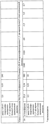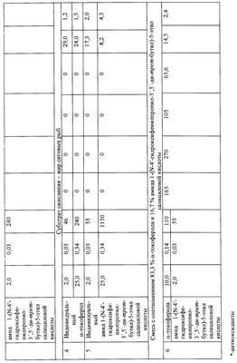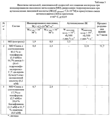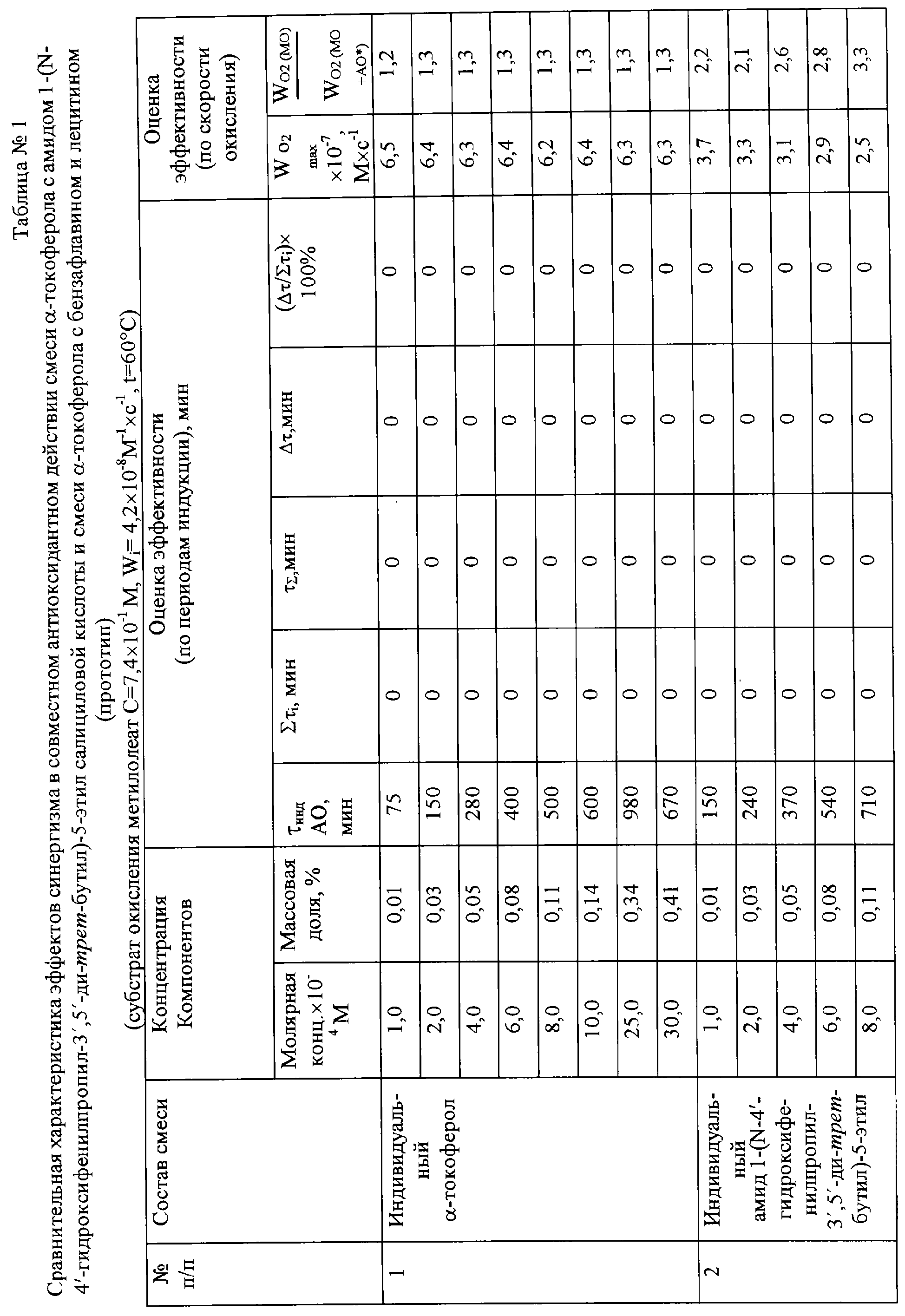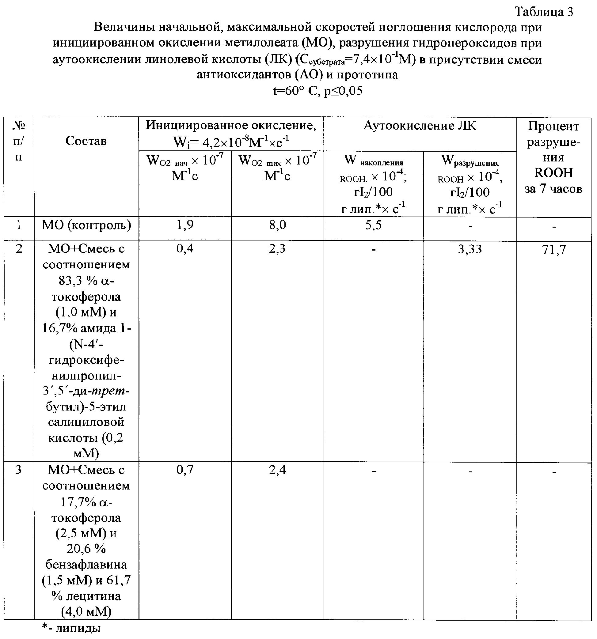 Таким образом, соединение амид 1-(N-4′-гидроксифенилпропил-3′,5′-ди-трет-бутил)-5-этил салициловой кислоты проявляет активность в реакции с пероксильными радикалами с константой скорости реакции К7=0,52×104 М-1×с-1, снижает скорость процесса окисления липидов в смеси с -токоферолом в 2-5 раз, а также дополнительно снижает уровень гидропероксидов, образующихся в процессе окисления липидов, на 71,7% (табл.3). Разрушение гидропероксидов под влиянием смеси заявляемого соединения, в свою очередь, является причиной выигрыша в периодах индукции и обеспечения высокой эффективности.