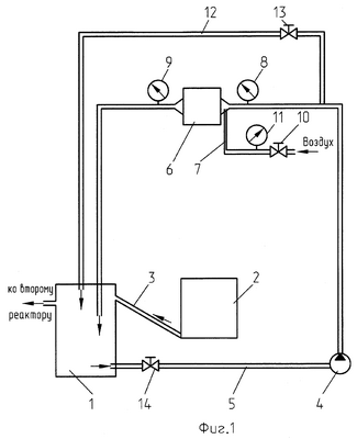 Давление в системе на входе гидродинамического генератора 6, необходимое для его нормальной работы, устанавливается не менее 0,2 МПа. Давление на выходе генератора 6 за счет его достаточно высокого гидравлического сопротивления будет ниже, диапазон его изменения должен находиться в пределах 0,1÷0,4 МПа. Для измерения давления на входе и выходе генератора устанавливаются манометры 8 и 9. Регулировочный вентиль 10, установленный на патрубке 7, предназначен для регулирования подачи воздуха, а манометр 11 – для определения его давления, которое должно превышать давление в трубопроводе 5. Вывод генератора на резонансный режим производится с помощью байпасного трубопровода 12, путем установки положения регулировочной задвижки 13, а по производительности регулировка ведется при помощи задвижки 14. При использования в непрерывном режиме (фиг.2) монтаж генератора производится в подводящий пульпопровод 3. Расход воздуха определяется по формуле:
