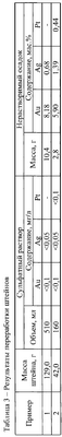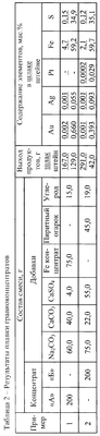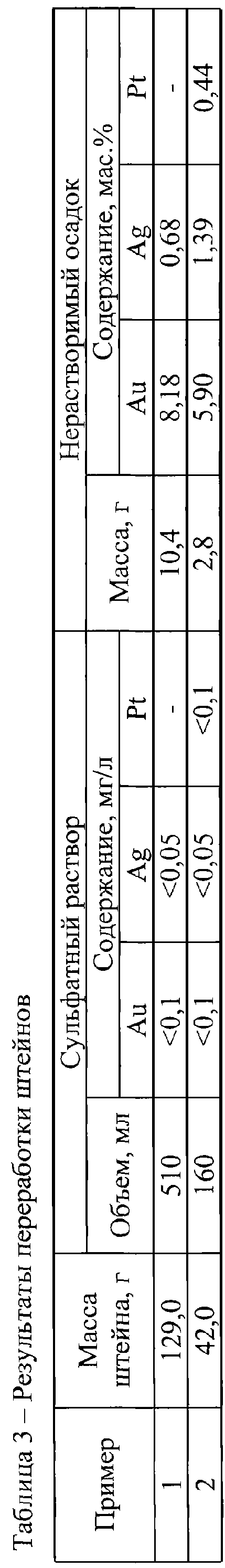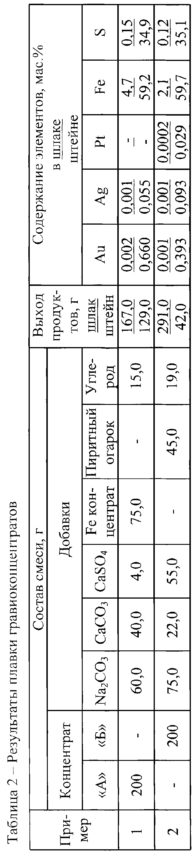 Приготовили две шихты, включающие гравиоконцентрат, флюсы и добавки. Каждую шихту загружали в графитошамотовый тигель, расплавляли и выдерживали при температуре 1300°С в течение 60 минут в тигельной печи с карбидокремниевыми электронагревателями. По окончании плавки тигли извлекали из печи и охлаждали. Продукты плавки – шлак и штейн выбивали из тигля, разделяли, взвешивали и анализировали на содержание элементов пробирным и химическим методами анализа. Данные по составам шихт, выходам продуктов обогатительной плавки, содержанию в них благородных металлов, железа и серы приведены в таблице 2. Полученные результаты и расчеты показывают, что обогатительная плавка концентратов в заявляемом способе позволяет эффективно коллектировать благородные металлы в троилитовый штейн с извлечением на 98,5÷99,1% и получать шлаки с низким, до 0,003%, остаточным содержанием благородных металлов. Штейны, полученные в опытах 1 и 2, в кусках помещали в лабораторный реактор и заливали водой в соотношении Т:Ж=1:4. При этом в течение 30 минут куски штейна диспергировались, превращаясь в мелкодисперсный осадок черного цвета. После перемешивания при комнатной температуре в течение 10 минут пульпу фильтровали. Щелочные растворы, по данным атомно-абсорбционного анализа, благородных металлов содержали менее 0,1 мг/л. Отфильтрованные нерастворимые осадки с остаточной влажностью около 15% загружали в противни из нержавеющей стали, помещали в сушильный шкаф и сушили при температуре 70÷80°С в течение 1,5-2 часов. В процессе сушки происходило окисление сульфида железа, материал изменил свой цвет с черного до красно-коричневого, масса высушенных осадков увеличилась на 10-12% по сравнению с массой исходных штейнов. Высушенные нерастворимые осадки смешивали с концентрированной 98%-ной серной кислотой в массовом соотношении 1:1,5, полученную смесь в виде пасты загружали в противень из нержавеющей стали, помещали в муфельную печь и выдерживали при температуре 350°С в течение двух часов. По завершении термообработки спеки измельчали и выщелачивали в 10% растворе серной кислоты в лабораторном реакторе при температуре 60°С в течение 60 минут. По окончании выщелачивания пульпу фильтровали, нерастворимые осадки сушили и взвешивали. Продукты опытов – сульфатные растворы и нерастворимые осадки анализировали на содержание благородных металлов. Результаты переработки штейнов примеров 1 и 2 представлены в таблице 3. Полученные результаты показывают, что переработка концентратов БМ заявляемым способом позволяет эффективно концентрировать благородные металлы в целевом нерастворимом осадке со сквозным извлечением 98,5÷99,1% и выводить сопутствующие примеси в шлак и сульфатный раствор.