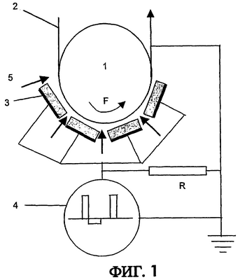 На фиг.1 показано устройство обработки, содержащее вращающийся опорный цилиндр 1, по которому движется стальная полоса 2, которая покрыта антикоррозионным защитным маслом и которую необходимо обезжирить. Этот цилиндр 1 вращается в направлении, показанном стрелкой F, и, в случае необходимости, может охлаждаться. Он соединен с массой через полосу 2.