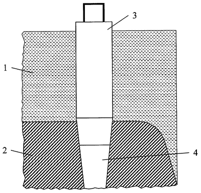 Способ формирования поясняется чертежом, на котором показаны жидкая фаза самообжигающегося анода 1, конус спекания самообжигающегося анода 2, анодный штырь 3 с закрепленной на нем пробкой 4