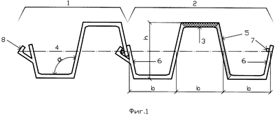 Таким образом, было установлено, что в горизонтальном сечении каждого из вертикальных элементов 1 и 2 отношение площади полки 3 к площади стенки 5 должно быть выдержано в пределах 0,9-2,1 при изменении тупого угла между полкой 3 и стенкой 5, а также между полкой 3 и полустенкой 6, от 91 до 150 градусов в зависимости от значения этого угла , выраженной таблицей 1, что обеспечивает минимальную удельную металлоемкость шпунтовой стены рассматриваемой конструкции.