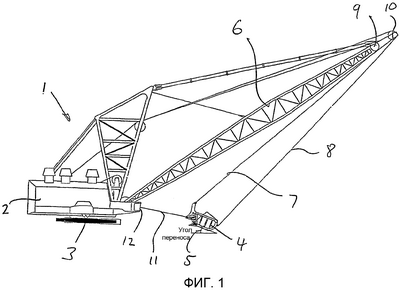 Драглайн 1, обычно применяемый для крупномасштабных горнодобывающих работ, имеет корпус 2, установленный с возможностью вращения на основание 3 в виде платформы, которое обычно содержит направляющие, позволяющие драглайну двигаться в обратном направлении для достижения заданного положения для работы ковша 4.