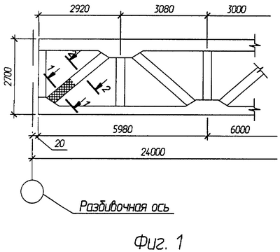 на фиг.2 изображено поперечное сечение 1-1 на фиг.1 участка сжатого раскоса с тяжелыми термическими повреждениями: