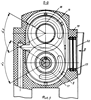 Зоны уплотнения наружных диаметров шестерен пневмомотора, обеспечивающие рабочие радиальные и торцевые зазоры в пределах 0.015-0.02 мм относительно корпуса, выполнены за счет расточек корпуса под рабочие шестерни, охватывают дуги секторов 1 и 2, равных 2.5-3 шага зубьев шестерен.