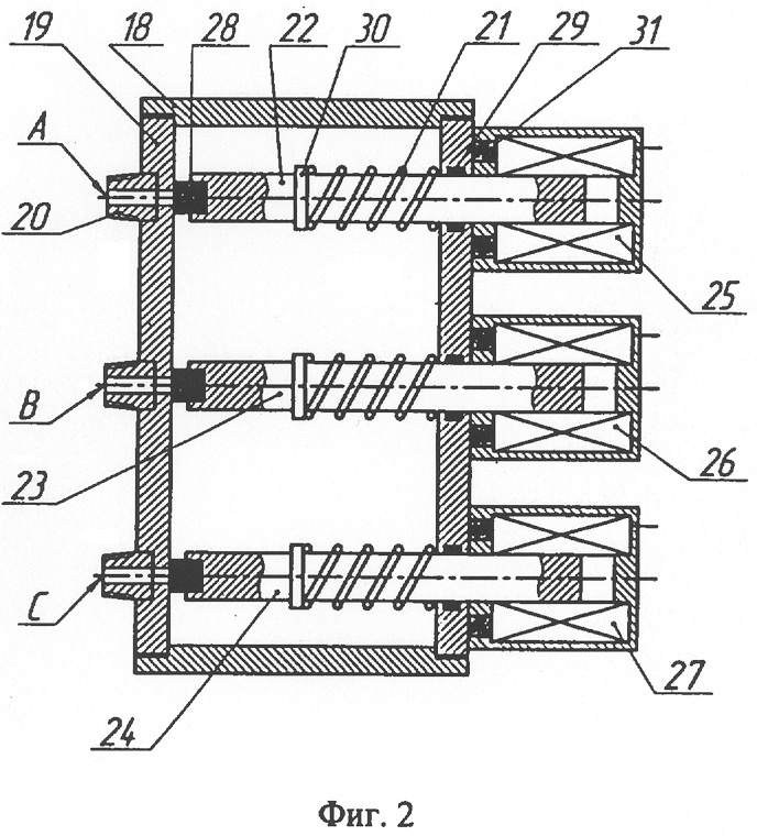 Электромагнитный распределитель метанола (фиг 2) конструктивно выполнен в виде герметичного, закрытого крышками 18 корпуса 19 с тремя выполненными в нем входным/выходным отверстиями А, В и С. Снаружи корпуса по осям этих отверстий вварены три штуцера 20, а внутри – установлены подпружиненные с помощью пружин 21 стержни 22, 23 и 24, одним концом взаимодействующие с соответствующими электромагнитами 25, 26 и 27, а другой конец каждого стержня снабжен жестко связанным с ним затвором 28, перекрывающим соответствующее отверстие в корпусе электромагнитного распределителя метанола. Уплотнительное кольцо 29 обеспечивает герметичность корпуса электромагнитного распределителя метанола при перемещении стержня. Съемное разрезное кольцо 30 служит упором для пружины. В магнитной цепи каждого электромагнита установлен постоянный магнит 31.