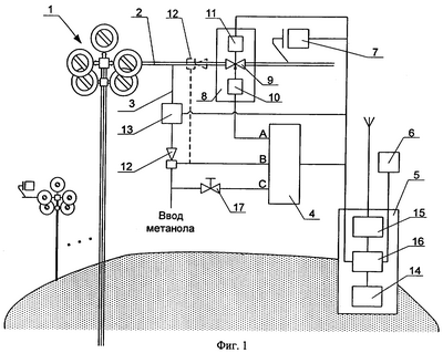1. Устройство для контроля и регулирования процесса добычи газа в газовых и/или газоконденсатных скважинах, оборудованных системой ввода ингибитора – метанола, содержащее контроллер, подключенные к нему источники питания, радиопередающий узел или модем с антенной для обмена информацией с диспетчерским центром, датчик параметров соответствующей газовой и/или газоконденсатной скважины, узел регулирования расхода газа и узел подачи метанола, взаимосвязанные с контроллером, причем узел расхода газа содержит управляемый кран с приводом и датчиком положения, а узел подачи метанола содержит управляемый кран с приводом и датчик потока метанола, отличающееся тем, что в него дополнительно введены эжектор, установленный на линии ввода метанола перед узлом подачи метанола или на газовой линии перед узлом регулирования расхода газа, связанный с контроллером электромагнитный распределитель метанола, один из гидравлических входов/выходов которого соединен с приводом управляемого крана узла регулирования расхода газа, а два других соответственно подсоединены к линии ввода метанола и к полости разрежения эжектора.