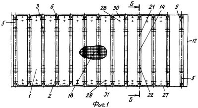 Для чего в промежутке между вновь установленной и ранее установленной рамами 2 крепи бурят шпуры 23, 24 и 25, 26, ориентируя их в одной поперечной плоскости и наклонно в сторону нетронутого массива. Причем шпуры 23 и 24 бурят в местах сопряжения кровли с боками выработки, а шпуры 25 и 26 – в бока выработки с последующей установкой решетчатых затяжек 27 на уровне угловых звеньев 5 рамы 2 крепи и анкеров 28, 29 и 30, 31 соответственно в упомянутые шпуры 23, 24 и 25, 26 (фиг.6).