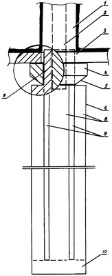 Количество выступов 8 и канавок 9 определяется несущей способностью крепи, при этом днища канавок являются продолжением верхней цилиндрической части 7 насадки 6, т.е. днища канавок выполняют роль направляющих поверхностей для лезвия 5 деформирующего элемента 4, обеспечивая соосное с насадкой его смещение без перекосов.