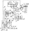 Автоматическая газодизельная система трактора состоит из воздушного фильтра 1 с рукавом 2 подачи воздуха, соединенным со смесителем 3, к последнему подсоединен рукав 4 подачи смеси, который соединен с помощью впускной трубы (не показана) с двигателем 5, газобаллонной установки (не пронумерована), состоящей из 18 газовых баллонов 6 с Р=20 МПа, укрепленных на задней полураме трактора (не показана), при этом к газовым баллонам 6 последовательно присоединены: трубопроводы 7, расходный вентиль 8, трубопровод 9, фильтр газовый 10, трубопровод 11, газовый редуктор 12 высокого давления, трубопровод 13, электромагнитный газовый клапан 14, трубопровод 15, газовый редуктор 16 низкого давления, газовый жиклер 17, шланг 18 подачи газа, дозатор 19 газа, шланг 20, а к шлангу 20 присоединен смеситель 3, электрической цепи 21, присоединенной к щитку (не показан) предохранителей трактора (клемма + 12 В), причем к электрической цепи 21 присоединен включатель 22, к которому присоединена цепь 23 подачи напряжения питания, к цепи 23 присоединены электронный блок 24 переключения режимов (БПР), который состоит из модуля 25 питания, триггера 26, цепи 27, преобразователя 28, аналоговой цепи 29, порогового детектора 30, сигнальной цепи 31, логического устройства 32 и контролирующего устройства 33, при этом к цепи 23 подачи напряжения питания присоединен модуль 25 питания, к которому присоединена цепь 34, соединяющая модуль 25 питания с «массой» трактора, а на двигателе 5 установлен датчик 35 температуры, цепь 36 соединяет датчик 35 температуры с триггером 26, цепь 27 соединяет триггер 26 с логическим устройством 32, генератор 37 установлен на двигателе 5, а датчик 38 оборотов установлен на генераторе 37, цепь 39 соединяет датчик 38 оборотов с «массой» трактора, цепь 40 соединяет датчик 38 оборотов с преобразователем 28, а цепь 29 соединяет преобразователь 28 с пороговым детектором 30, цепь 31 соединяет последний с логическим устройством 32, а цепь 41 управления соединяет логическое устройство 32 с цепями 42 управления и 43 питания, цепь 42 управления соединена с электромагнитом 44 механизма 45 ограничителя запальной дозы, последний соединен с топливным насосом 46 высокого давления (ТНВД), при этом в механизме 45 ограничителя установлены: электромагнит 44 ограничителя, планка 47 и датчик 48 положения, цепь 49 соединяет датчик 48 положения с контролирующим устройством 33, цепь 50 соединена с электромагнитным газовым клапаном 14, а к цепи 41 управления присоединен электронный блок 51 электронно-механического регулятора (ЭМР), который состоит: из модуля 52 питания, генератора 53 импульсов, сигнальной цепи 54, широтно-импульсного модулятора 55, сигнальной цепи 56, усилителя 57. Цепь 43 питания соединяет цепь 41 управления с модулем 52 питания, цепь 58 соединяет модуль 52 питания с «массой» трактора. На двигателе 5 установлен топливный насос 46 высокого давления, а на последнем установлены: механический регулятор 59, рычаг 60 регулятора 59, механизм 45 ограничителя, датчик 61 положения рычага 60 регулятора 59, а цепь 62 соединяет датчик 60 положения с широтно-импульсным модулятором 55, жгут 63 управления соединяет усилитель 57 с дозатором 19 газа, наполнительный вентиль 64 соединен с газобаллонной установкой и заправочным устройством 65.