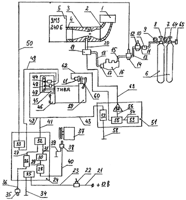Так как частота вращения к.в. двигателя 5 в газодизельном режиме превышает 1200 об/мин, при вращении ТНВД 46 механический регулятор 59 управляет рычагом 60, вызывая перемещение штока датчика 61. Датчик 61 изменяет свое сопротивление в зависимости от положения своего штока. Так как датчик 61 подключен цепью 54 к широтно-импульсному модулятору 55, а на второй вход широтно-импульсного модулятора 55 подключен цепью 56 генератор импульсов 53, на выходе широтно-импульсного модулятора 55 формируются импульсы, скважность которых изменяется пропорционально изменению сопротивления датчика 61. Данные импульсы по цепи 62 поступают на вход усилителя 57, где усиливаются по мощности и по жгуту 63 управляют дозатором 19 газа. Дозатор 19 газа под действием сигналов управления, поступающих по жгуту 63, изменяет свое проходное сечение путем открывания на определенную величину заслонки и регулирует количество проходящего через него газа, так как давление газа на входе в дозатор 19 стабилизировано газовым редуктором 16.