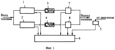 В процессе нормальной работы системы насосы 1 и 2 по команде, поступающей от блока управления 6, подают топливо через обратные клапаны 3 и 4 в двигатель. Величина подаваемого топлива, потребного для работы двигателя, определяется датчиком 5, отражающим параметры двигателя, которые передаются в блок управления 6, который управляет работой насосов 1 и 2, увеличивая или – уменьшая подачу топлива в двигатель. Подача каждого насоса определяется датчиками 7 и 8, показания которых также поступают в блок управления для использования при регулировании режимов работы двигателя и для принятия решения о работоспособности насосов и необходимости отключения отказавшего насоса.