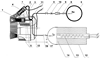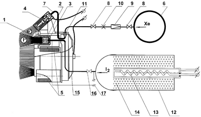 Она включает ЭРД (СПД) и СХП. Двигатель содержит разрядную камеру 1, выполненную из изолятора и имеющую форму открытого с одной стороны тора, внутри которой установлен кольцевой анод 2, снабженный нагревателем 3, катод 4 и магнитную систему 5. Рабочее тело катода (ксенон высокой чистоты) заправлено в баллон высокого давления 6, соединенный трубопроводом 7 с катодом 4, причем трубопровод 7 содержит арматуру: клапаны 8, редукторы 9 (на чертеже показан один), жиклеры 10, а также трубопровод снабжен электроизолятором 11. Емкость с иодом 12, снабженная нагревателем 13 и содержащая иод в твердом состоянии 14, соединена трубопроводом 15, содержащим клапан 16 и нагреватель 17, с анодом 2 разрядной камеры 1.