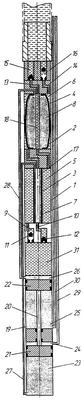 Изобретение поясняется чертежом, где схематично изображено предлагаемое устройство, установленное в обсадной трубе в скважине.