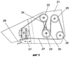 Как было установлено в результате исследований, возникающие за счет колебательного привода ножевого бруса 8 непрерывно изменяющиеся импульсные напряжения и толчки передаются в привод с гибкой связью и далее передаются гибкой связью 5 на остальные части привода. Это воздействие вызывает отрицательные последствия, а именно повышенный износ самой гибкой связи 5 и подшипниковых опор натяжного и направляющих роликов 4, 22 и 23 и ременного шкива 26 (фиг.5), что значительно сокращает их долговечность или срок службы.