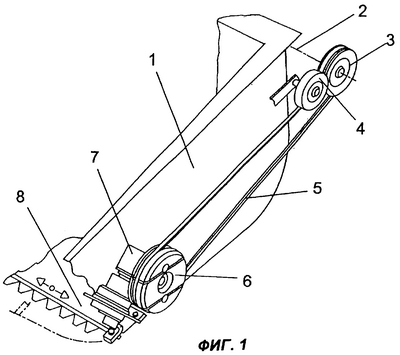 На фиг.1 представлена часть камеры 1 режущего аппарата уборочной машины и ножевого бруса 8, установленного с возможностью горизонтального регулировочного смещения, условно показанного штрихпунктирными линиями. Ножевой брус 8 приводится приводным механизмом 7 ножевого бруса, преобразующим вращательный привод в возвратно-поступательное режущее движение ножевого бруса 8. Приводное усилие отбирается от приводного вала 2 через ременный шкив 3 и посредством гибкой связи 5, передается на приводной механизм 7 ножевого бруса. В качестве гибкой связи 5 в данном примере выполнения использован клиновой ремень. Для поддержания необходимого натяжения гибкой связи 5 служит натяжной ролик 4, который, как и приводной механизм 7 ножевого бруса, позиционирован на боковой стенке камеры 1 режущего аппарата. Благодаря тому, что гибкая связь 5 огибает натяжной ролик 4, одновременно обеспечивается необходимая длина гибкой связи 5 для горизонтального регулировочного смещения ножевого бруса 8 с изменением его расстояния от приемных шнеков (не показаны). Горизонтальное регулировочное смещение ножевого бруса 8 осуществляется в зависимости от убираемой культуры и условий уборки, например для уборки полеглых зерновых. С учетом этих условий гибкая связь 5 должна иметь относительно большую длину, что способствует возникновению собственных поперечных колебаний или вибрации.