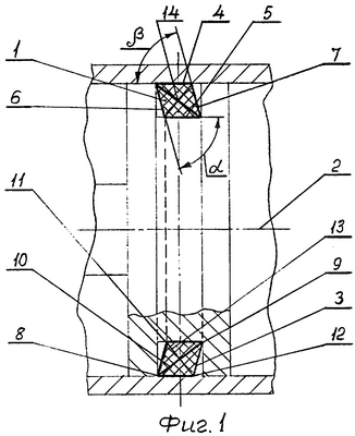 На фиг.1 кольцо уплотнительное 1 с осью 2 представляет собой в сечении усеченный конус 3, образованный двумя четырехугольниками, расположенными зеркально относительно оси кольца 2. Две стороны кольца 1 – 4 и 5 параллельны его оси 2, а стороны 6 и 7 расположены под углами и , равными 0°-90°. На фиг.1 изображен частный случай, когда = , т.е. сечение кольца 1 – параллелограмм, у которого 8 и 9 – уплотнительные кромки, 10 – большая диагональ параллелограмма, 11 и 12 – тупоугольные кромки, 13 – малая диагональ сечения, а 14 – центр сечения кольца 1.