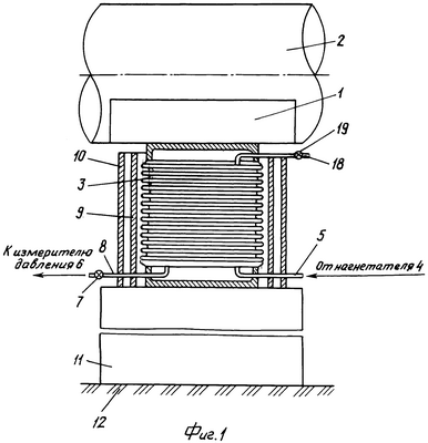 Начальное давление рабочей среды в сильфоне 3, задаваемое нагнетателем рабочей среды через штуцер 5, выбирается исходя из силовой нагрузки трубопровода 2 на опору и рабочего диапазона сильфона 3.