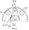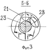 Вибраторы 19 и 20 по конструкции идентичны и могут различаться незначительно лишь размерами, но принципиально они одинаковы. Корпус 9 является корпусом вибраторов 19, 20. Вибратор 19 или 20 состоит из цилиндра 21 (см. Фиг.2-6), имеющего дисбаланс, вызванный специальным распределением его массы относительно оси. Цилиндр 21 плотно насажен на втулку 22, с помощью которой с возможностью вращения закреплен от осевого смещения на оси 23. Ось 23 заднего вибратора 20 с возможностью осевого перемещения посажена в крышку 14 и перегородку 24 корпуса 9, ось 23 переднего вибратора 19 плотно посажена в соединительную резьбовую втулку 9а с воздухоподводящими каналами, соединяющую воедино корпус 9 из двух частей и в перегородку 25 корпуса 9. Заодно с осью 23 заднего вибратора 20 выполнен поводок 26, связывающий задний вибратор 20 через шпильки 27, с возможностью перемещения посаженные в крышку 14, резьбовое кольцо 18 с калибром 16.