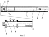 2. Устройство для введения плети пластмассовых труб в восстанавливаемый трубопровод, содержащее защитные элементы, операционную камеру, оголовок, калибр, вертлюг, тяговый трос и тяговое устройство, отличающееся тем, что оно включает компрессор и гибкий пневмопровод, проложенный в полости плети и подключенный к оголовку для подачи сжатого воздуха в его полость от компрессора, в оголовке размещены два вибратора, приводимые в действие сжатым воздухом, и размещенные: передний – в передней части оголовка, прикрепленного посредством вертлюга к тяговому тросу, задний – в задней части оголовка, прикрепленного к концу плети; а на задней части оголовка насажен сдвижной подпружиненный калибр, скрепленный поводком с задним вибратором, установленным с возможностью его смещения вдоль оси, при этом выхлопные отверстия для отработавшего воздуха за вибраторами направлены вперед по ходу оголовка под углом 45-60° к его оси, причем выхлопные отверстия за задним вибратором сообщены со входом переднего вибратора и глушатся калибром при его сдвиге.