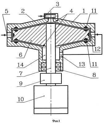 После заполнения устройства жидкостью включается электродвигатель 10, который приводит в движение посредством муфты 9 вал 7 с закрепленным на нем диском 6. Под давлением жидкость поступает во входной канал 3, где происходит изменение прямолинейного направления ее движения на вращательное, ускорение и подача в полость 2. Далее под действием давления, приложенного со стороны входного канала 3, и действием центробежных сил она перемещается между торцевыми поверхностями статора 1 и диска 6 на их коническом участке, имея минимальное гидравлическое сопротивление, дальнейшее продвижение жидкости происходит на цилиндрическом участке зазора между статором 1 и диском 6 с интенсивным выделением тепловой энергии в зонах несквозных отверстий 11 в условиях повышенного давления из-за действия центробежных сил, далее она частично отводится через выходной канал 5, а частично через перепускное отверстие 12 поступает к отверстию 13 камеры 14 для установки торцевого уплотнения. Из камеры 14 жидкость устремляется в зазор между диском 6 и статором 1 и в дальнейшем, минуя конический и цилиндрический участки, отводится через выходной канал 5 и подается в систему отопления или горячего водоснабжения.