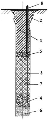 Длину участков скважины, занятых монолитной пробкой 1, буферным промежутком 5, засыпным участком 3 и воздушным промежутком 4 подбирают опытным путем или по аналогии.