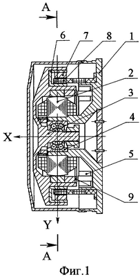 В роторе гироскопа выполнена кольцевая полость П-образного сечения, в которой закреплен магнитопровод 6. На магнитоповоде 6 расположен один ряд, например, из девяти постоянных магнитов 7, линии намагниченности которых направлены в одном направлении (к центру или от центра). Неподвижные дугообразные катушки 8 закреплены на корпусе гироскопа и расположены в П-образной полости ротора таким образом, что верхняя часть намотки катушки размещена напротив ряда постоянных магнитов 7. Датчики 5 угла выполнены, например, в виде четырех П-образных сердечников, размещенных на корпусе 1 гироскопа попарно вдоль измерительных осей гироскопа. На каждом сердечнике датчиков 5 угла расположены две катушки: возбуждения и съема сигнала. Подвижным элементом датчиков 5 угла является кольцо 9 из магнитного материала, располагаемое на роторе 3 гироскопа. Такая конструкция датчиков 5 угла позволяет производить измерения по двум осям. Сигнальные катушки датчиков 5 угла каждого из двух измерительных каналов включены последовательно встречно так, что наводимые в них ЭДС вычитаются.