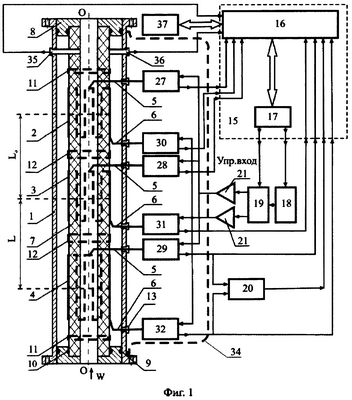 Входные разделительные конденсаторы 22 и выходные разделительные конденсаторы 23 применены с целью одновременного подключения каждого из первых вводов-выводов 5 и вторых вводов-выводов 6 к двум различным электрическим цепям: через входной разделительный конденсатор 22 – к цепи возбуждения резонаторов 2, 3, 4, содержащей один из входных усилителей 21, управляемый коммутатор 19 и управляемый высокочастотный генератор 18, а через выходной разделительный конденсатор 23 – к измерительно-вычислительной цепи, содержащей передающий тракт одного из приемо-передающих трактов 27, 28, 29, 30, 31, 32 и вычислительно-управляющий блок 15.