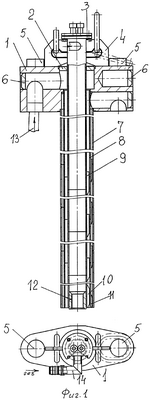 Содержит корпус 1, крышку 2, фланец 3, ребра 4, накладки 5, заглушки 6, наружную трубу 7, среднюю трубу 8, центральную трубу 9, ребра 10, 11, втулку 12 для крепления жезла, патрубок 13 подачи воды и газообразного азота для охлаждения измерительных кабелей, пропущенных через центральный канал фурмы, патрубка 14 подачи газообразного азота для отстрела использованного сменного блока 58.
