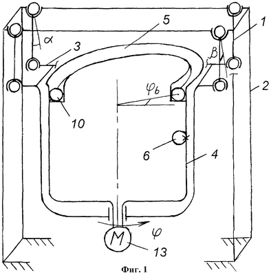 На фиг.1 представлена структурная схема устройства для проведения способа оценки износа покрытий и качества поверхностей деталей машин; на фиг.2 изображено автобалансирующее устройство с шариками в желобе, которое заполнено жидкостью, вид сверху, на фиг 3 – поперечный разрез Б-Б на фиг.2; на фиг.4 изображена структурная пространственная схема устройства в работе. Использованы следующие обозначения: 1 – опоры со сферическими шарнирами; 2 – корпус; 3 – внутренняя подвижная часть, содержащая бак; 4 – барабан; 5 – автобалансирующее устройство (АУ); 6 – неуравновешенная масса; 7 – корпус АУ; 8 – радиальные перегородки; 9 – кольцевой желоб; 10 – шарики; 11 – крышка АУ; L – расстояние между кромкой бака и стенкой корпуса; XOYZ – система отсчета; – угловая скорость движения ротора-барабана; Мdr – приводной крутящий момент; mb – корректирующая масса, представляющая группу испытуемых шариков; – угловая координата неуравновешенной (дисбалансной) массы; b – угловая координата центра шариков; – угловая координата движения штоков вокруг оси OY в плоскости ZOX; – угловая координата движения штоков вокруг оси ОХ в плоскости ZOY;