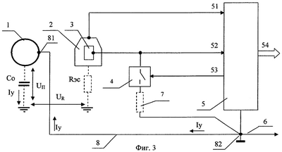 Структурная схема устройства измерения потенциалов электрохимической защиты приведена на фиг.3. Основными элементами устройства являются электрод сравнения 2, вспомогательный электрод 3, ключ поляризации 4 и измерительный блок 5, который имеет измерительные входы 51 и 52, предназначенные для измерения присутствующих на них потенциалов электродов относительно потенциала общей шины 6. Данные входы подключены соответственно к электродам 2 и 3, а общая шина 6 соединена с объектом защиты 1. Вспомогательный электрод 3 при этом соединен с объектом защиты 1 через ключ поляризации 4, управляющий вход которого соединен с управляющим выходом 53 измерительного блока 5. Конструктивно ключ поляризации 4 и общая шина 6 соединены с объектом защиты 1 общим проводником 8, подключенным к точкам 81 и 82. Последовательно с ключом поляризации 4 может быть включен токоограничивающий резистор 7.