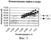 Компьютер 13 принимает данные с выхода фотоприемников 7 и 8, поступившие на его вход через предварительные усилители 9 и 10, входы аналого-цифрового преобразователя 11 и интерфейса 12. После этого сигнал с фотоприемника 7 задерживается на 90° и сравнивается с сигналом с фотоприемника 8. В результате сравнения находятся поправочные коэффициенты как функция от угла между фотоприемником 7 и источником лазерного излучения 6, характеризующие распределение загрязнения вдоль окна прозрачности – часть 20 рассеивающего объема 1. Далее соответствующие коэффициенты умножаются на соответствующее значение амплитуд сигнала с выхода фотоприемника 8 в углах поправки. После этого по заданным углам производится сравнение этого результата (инвариантного к загрязнению окна прозрачности – части 20 рассеивающего объема 1) с измерительными характеристиками, представленными на фиг.4 и фиг.5. По результатам сравнения определяется концентрация нефти в воде, результаты измерений сохраняются. Далее определяется превышение измеренной концентрацией ПДК, например 100 мг/л, и длительность превышения, например 1 минута. Если условия превышения по ПДК и длительности превышения выполняются, компьютер 13 сигнализирует об этом. В случае превышения предельно допустимого значения компьютер 13 переходит к программе устранения причин превышения, в которой используются блок аварийной сигнализации 14, блок калибровки 15 и блок промывки 16.
