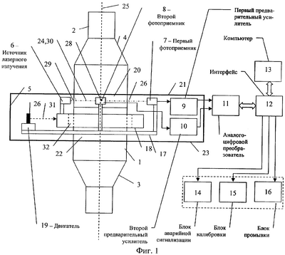 Для реализации устройства могут быть использованы: источник лазерного излучения 6 на базе лазерного диода ближнего инфракрасного диапазона мощностью 1-3 мВт; фотоприемники 7 и 8 на базе фотодиода КФДН с оптической системой, обеспечивающей узкое поле зрения; предварительные усилители 9 и 10 на базе AD823; аналого-цифровой преобразователь 11 и интерфейс 12 – устройства ввода/вывода данных фирмы «Advantech» серии ADAM-5000; компьютер 13 – PC AT 386 и выше, либо любой PC-совместимый промышленный компьютер, блок аварийной сигнализации 14, блок калибровки 15, блок промывки 16 аналогичны приведенным в прототипе.