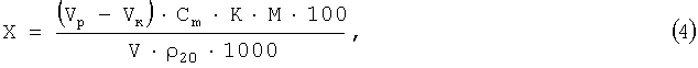 В коническую колбу вместимостью 250 см3 вносят вычисленный по формуле 1 объем анализируемой пробы, приливают рассчитанные объемы ледяной уксусной кислоты и раствора йодида калия или натрия. Растворы перемешивают в течение 30 мин в темном месте. Затем приливают 50 см3 дистиллированной воды и титруют выделившийся йод раствором тиосульфата натрия с выбранной молярной концентрацией. В условиях рабочего опыта, но без добавления пробы проводят контрольный опыт. Массовую долю нитроксильной группы в пробе (X) в процентах рассчитывают по формуле где Vp, Vк – объемы раствора тиосульфата натрия, израсходованные на титрование в рабочем и контрольном опытах соответственно, см3; Сm – концентрация раствора тиосульфата натрия, моль/дм3; К – поправочный коэффициент к концентрации раствора тиосульфата натрия; М – молярная масса нитроксильного радикала, г/моль; V – объем пробы, взятый на анализ, см3;