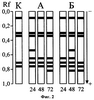 По сравнению с общей активностью кислых гидролаз моллюсков изменения в составе множественных форм ДНКазы и КФ возникают позднее и носят более специфический характер. В частности, для действия каждого из использованных нами токсикантов характерна собственная, специфическая динамика активации «индуцибельных» форм ДНКазы. Формирующийся спектр функционирующих форм зависит, видимо, как от природы токсического вещества (особенностей его биотоксического эффекта), так и от силы (концентрации и длительности) его травмирующего воздействия. Принципиальным моментом является то, что состав множественных форм и ДНКазы, и КФ живородки речной отличается стабильностью характеристик в норме и не обнаруживает отличий у моллюсков, собранных в разных местах обитания, благодаря чему возможно четкое определение нормы. Таким образом, любое качественное изменение в электрофоретическом спектре ДНКазы или КФ подопытных моллюсков является свидетельством действия пороговых или подпороговых концентраций токсикантов, что позволяет достаточно просто диагностировать токсическое загрязнение воды на основании визуальной оценки энзимограмм. При этом достаточно провести измерение при одной экспозиции опыта, так как изменения в спектре множественных форм тест-ферментов, возникнув при токсическом воздействии достаточной интенсивности, характеризуются развернутостью во времени (см. табл.4, фиг.1, 2, 4, 5). Экспозиция подобных тестов может находиться в пределах 18-48 ч (третий вариант способа) и 48-72 ч (четвертый вариант способа).