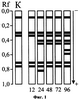 Токсичность тестируемой воды в четвертом варианте способа определяют по энзимограммам КФ. Электрофорез проводят в блоках (колонках или пластинах) ПААГ по методике Дэвиса; концентрация разделяющего геля должна составлять 5,7%, отношение концентраций метиленбисакриламида и суммы мономеров в его составе 2,6%, для концентрирующего геля эти величины должны равняться соответственно 3,9 и 20%. Перед нанесением экстракты белков разбавляют 40%-ным раствором сахарозы до конечной концентрации белка 1-1,5 мг/мл. При использовании колонок ПААГ высотой 8 см и диаметром 0,4 см на каждую наносят по 0,1 мл разбавленного экстракта, при использовании пластины ПААГ размером 15×6 см и толщиной 2 мм в ячейки сечением 1×5 мм и глубиной 10 мм вносят по 50 мкл образца. Электрофорез проводят в 0,032 М трис-глициновом буфере (рН 8,9) с бромфеноловым синим в качестве метчика, поддерживая температуру на уровне 5-7°С. Первые 10-15 мин (до вхождения белков в разделяющий гель) силу тока устанавливают на уровне 1 мА на колонку (1 мА/см ширины пластины), затем, до окончания электрофореза, ее увеличивают до 2 мА на колонку (2 мА/см пластины). Окончанием электрофореза считают смещение фронта, окрашенного метчиком, до 0,5-1 см от нижнего края блока ПААГ.