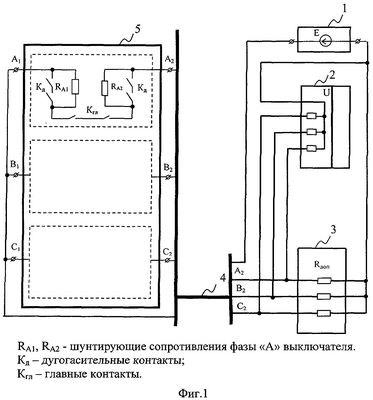 Электрическая схема полюса выключателя изображена на фиг.1. Кинематика выключателя такова, что при его включении вначале замыкаются главные контакты и между выводами полюса выключателя оказываются включенными последовательно два шунтирующих сопротивления. Позже замыкаются дугогасительные контакты и шунтируют оба сопротивления – то есть сопротивление между выводами полюса выключателя становится близким к нулю. Таким образом, при включении выключателя его активное сопротивление скачкообразно изменяется с бесконечности до значений двух шунтирующих сопротивлений и далее близко к нулю, которое определяется лишь переходными значениями контактных соединений.