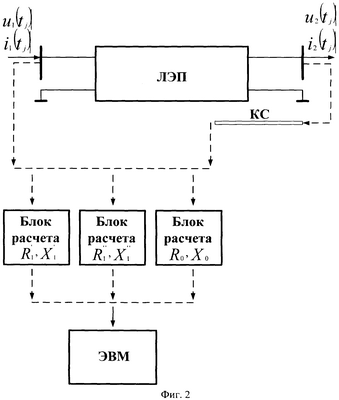 Способ может быть осуществлен с помощью устройства, представленного на фиг.2. В начале и в конце ЛЭП установлены регистраторы аварийных ситуаций (на фиг.2 не показаны) для создания массивов мгновенных значений токов начала и конца линии и напряжений начала и конца линии электропередачи с шагом дискретизации t. Регистраторы аварийных ситуаций через каналы связи связаны системой сбора и обработки информации, которая обычно расположена в начале ЛЭП. Устройство для определения текущих параметров линии состоит из трех параллельно включенных блоков расчета: блока расчета , блока расчета и блока расчета R0, X0. Входы этих блоков расчета связаны с началом линии электропередачи и через канал связи (КС) с ее концом. Выходы блоков расчета подключены к ЭВМ. Массивы отсчетов мгновенных значений напряжений и токов поступают на соответствующие входные шины блоков.