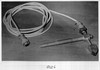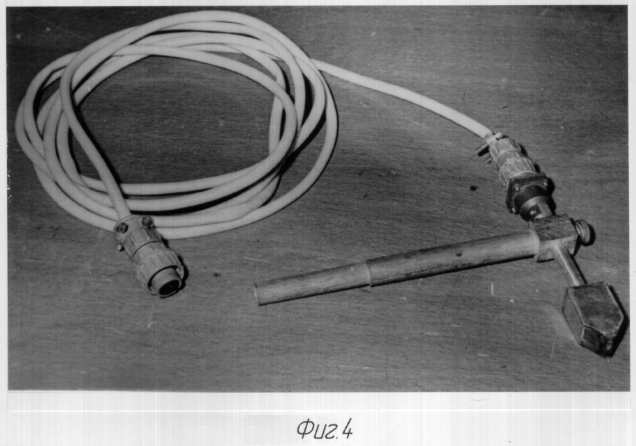 На фиг.1 изображена принципиальная схема, иллюстрирующая принцип точного обнаружения конкретного места (Точки) виткового замыкания по периметру дефектной секции 1 по предлагаемому способу применительно к различным типам обмоток якорей электрических машин постоянного тока на примере простой петлевой обмотки якоря с уравнительными соединениями (последние не показаны): токоподводящие контакты, соединенные с выходом генератора импульсных напряжений ГИН 2, – Высоковольтный 3 и Земля 4 на фиг.1 показаны условно (для упрощения чертежа), а практически они и индукционный датчик ИД 6 зафиксированы на одной общей измерительной изолирующей штанге; зоны, обозначенные прямоугольниками над рабочей поверхностью коллектора и над выводами витков у петушков коллектора, – это области перемещения индукционного датчика ИД 6 при настройке для соответствующего типа испытываемого якоря; на фиг.2 приведена принципиальная электрическая схема измерителя импульсных магнитных полей (индикатора с автономным питанием) ИИП 7 с индукционным датчиком ИД 6: Т – транзистор типа p-n-p, например, МП41А, работающий в режиме насыщенного ключа, к переходу эмиттер-база которого подключен индукционный датчик ИД 6, имеющий на своем магнитопроводе две взаимно противоположно сфазированные астатические обмотки и воздушный зазор – щель в направлении острого угла магнитопровода, а в коллекторной цепи – включен стрелочный измерительный прибор магнитоэлектрической системы, например, микроамперметр на 100 мкА, параллельно которому подключены электролитический конденсатор С для устранения колебаний стрелки микроамперметра при большой скважности импульсов измеряемого импульсного магнитного поля и при электрическом дуговом (искровом) пробое витковой изоляции испытываемого якоря; резисторы R1 и R2 – шунты к индукционному датчику ИД 6 и к микроамперметру, соответственно, – для регулирования чувствительности (Грубо и Точно) измерителя импульсных магнитных полей ИИП 7: переносной прибор, устанавливаемый на изолирующей подставке 8; фиг.3 иллюстрирует установку на переносном штативе с кронштейном и изолирующей измерительной штангой с индукционным датчиком ИД, ориентированным воздушным зазором – щелью своего магнитопровода над выводами витков секции обмотки испытываемого якоря тягового двигателя типа НБ-418к магистрального электровоза серии ВЛ 80к в непосредственной близости к петушкам коллектора, и токоподводящего электрода 3 – Высоковольтный – на изолирующей штанге: датчик ИД и электрод 3 разнесены друг относительно друга и снят второй токоподводящий электрод 4 – Земля, с целью устранения нагромождения всех указанных элементов в одном месте фотографии, и снят индукционный датчик ИД 6, зафиксированный на одной общей измерительной изолирующей штанге с токоподводящими электродами 3 и 4, по той же причине (см. фиг.1); фиг.4 иллюстрирует общий вид индукционного датчика ИД 6 с отдельной изолирующей измерительной штангой (см. фиг.3).
