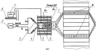 Место виткового замыкания (например, Точка ВЗ в петушках коллектора является наиболее типичным случаем дефекта как при классической технологии пайки, так и при более современной – сварки петушков коллектора с вставленными в них выводными концами секций обмотки якоря), входящее в короткозамкнутый контур, шунтирует (закорачивает) дефектный виток, поэтому ток в этом витке IВ от ГИН 2 – очень мал, а по короткозамкнутому контуру до места виткового замыкания и обратно протекает ток короткого замыкания IКЗ – основной ток ГИН 2 – IГИН, максимальное разностное импульсное магнитное поле которого и позволяет выявить точно и однозначно местоположение короткозамкнутого контура с местом виткового замыкания (фиг.1, Точка ВЗ).