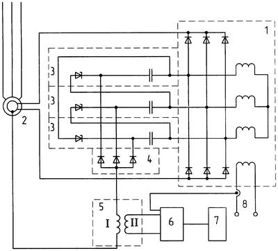 При работе возбудителя 1 на выводах фаз якорной обмотки возникает переменное напряжение, обуславливающее протекание тока через цепи 3 из последовательно соединенных конденсатора и стабилитрона. Поскольку вольт-амперная характеристика стабилитрона различна для разных направлений тока, то на стабилитронах появляется пульсирующее напряжение со стабильной амплитудой в широком диапазоне работы возбудителя. Пульсирующее напряжение с каждого стабилитрона через разделительные диоды 4 поступает на вывод вращающейся первичной I обмотки динамического трансформатора 5. Второй вывод этой обмотки подключен к массиву ротора синхронной машины. При работе возбудителя по вращающейся первичной I обмотке динамического трансформатора протекает пульсирующий ток, величина которого в широком диапазоне обратно пропорциональна величине сопротивления изоляции цепи возбуждения синхронной машины. Пульсирующий ток, протекающий по первичной I обмотке динамического трансформатора, индуцирует во вторичной II обмотке напряжение, обратно пропорциональное сопротивлению изоляции, которое поступает на формирователь сигналов 6. Для расширения диапазона работы на формирователь сигналов 6 дополнительно поступает напряжение от датчика 8, величина которого пропорциональна току возбуждения возбудителя. Сигнал с формирователя сигналов 6 поступает на исполнительный орган 7 для воздействия на информационно-коммутационную аппаратуру.